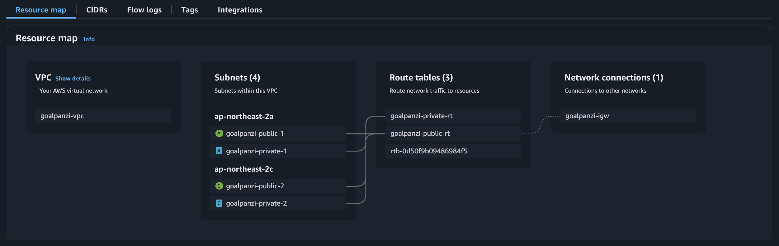 resource "aws_internet_gateway" "igw" { vpc_id = aws_vpc.vpc.id tags = { Name = "goalpanzi-igw" } } resource "aws_route_table" "public" { vpc_id = aws_vpc.vpc.id tags = { Name = "goalpanzi-public-rt" } } resource "aws_route" "internet_access" { route_table_id = aws_route_table.public.id gateway_id = aws_internet_gateway.igw.id destination_cidr_block = "0.0.0.0/0" } resource "aws_route_table_association" "public" { route_table_id = aws_route_table.public.id count = length(var.azs) subnet_id = aws_subnet.public[count.index].id }퍼블릭 서브넷이 외부와 통신할 수 있는 이유는 바로 인터넷 게이트웨이 덕분이다. 인터넷 게이트웨이는 VPC와 외부 인터넷을 연결하는 컴포넌트로 외부와의 통신을 지원한다. 하지만 인터넷 게이트웨이만으로는 충분하지 않는데, 퍼블릭 서브넷 내부의 트래픽이 "어디로 가야 할지" 알아야 하기 때문이다. 라우팅 테이블은 네트워크 트래픽이 어디를 향해야 하는지 정의한다.